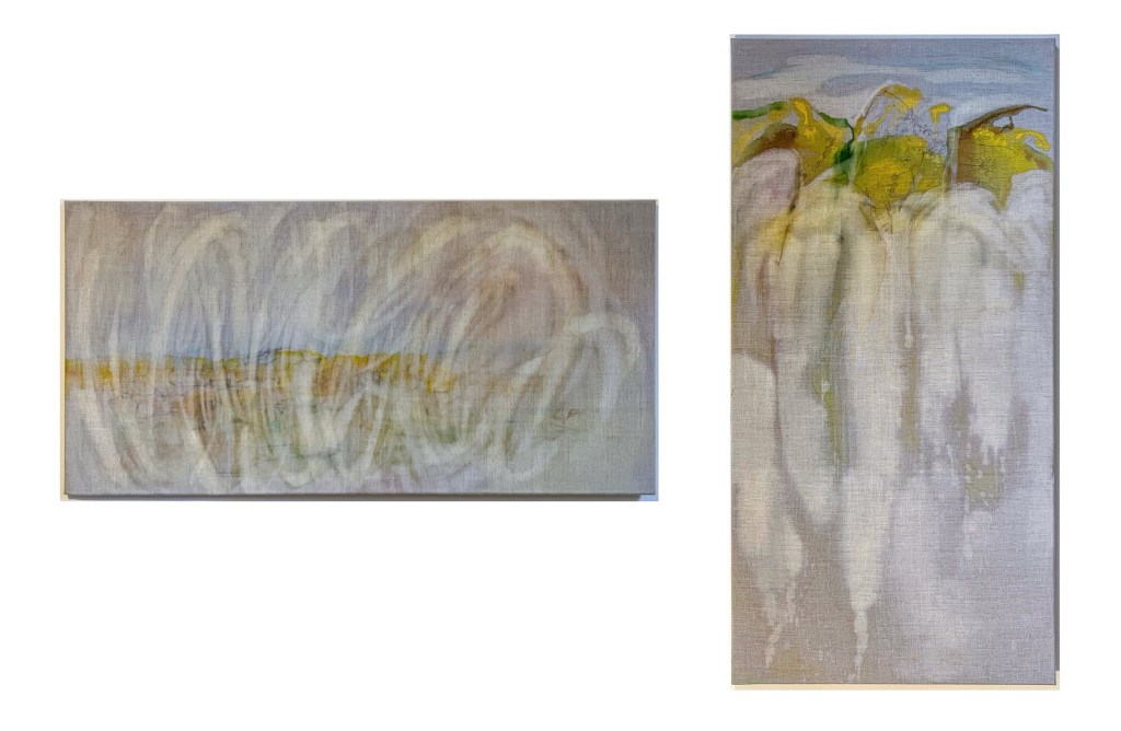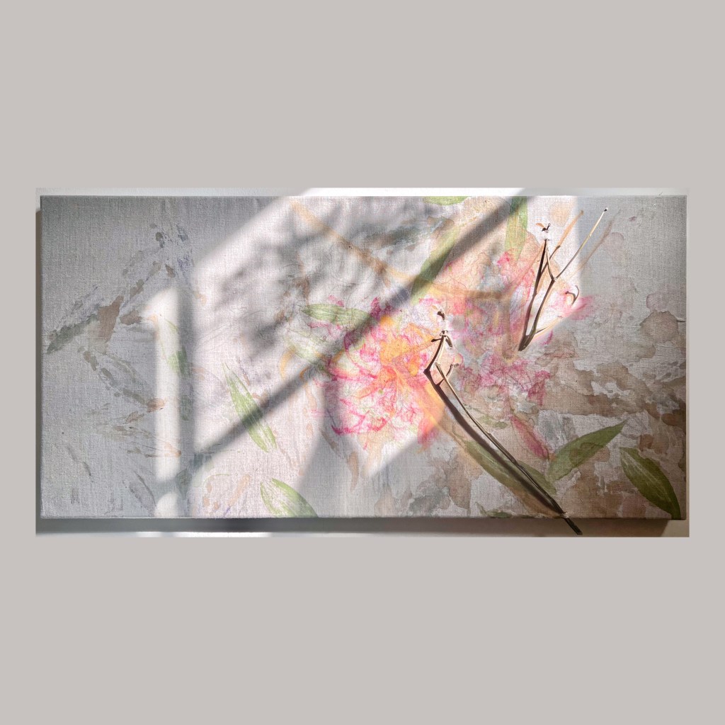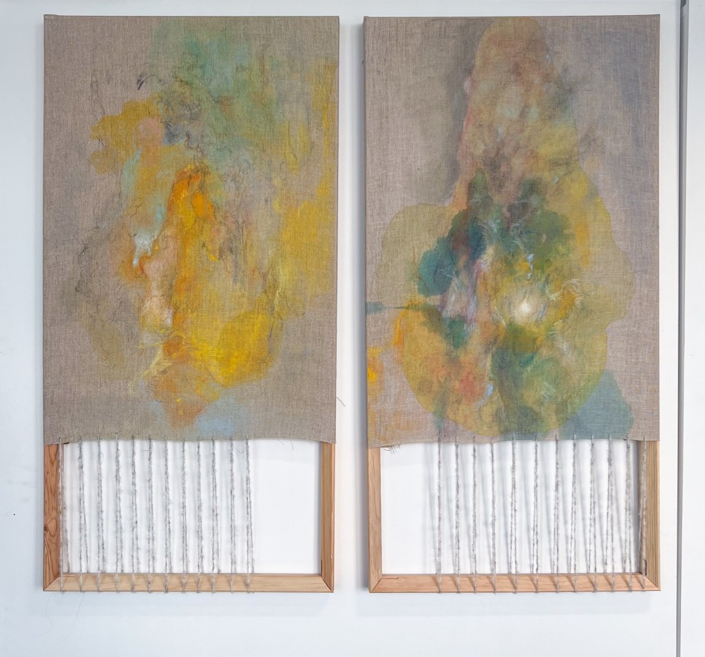 Ink, water-resolvable pastels and pencils and yarn on linen